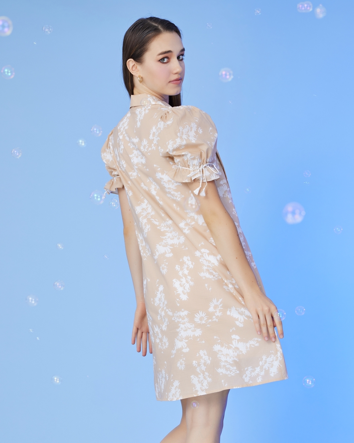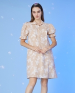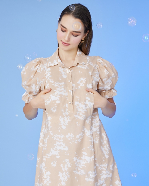 A shirt-style maternity and nursing dress adorned with doll sleeves, strings, and pearl buttons down the front. The dress is comfortable to wear and seamlessly conceals the milk channel, allowing mothers to nurse or pump on both sides simultaneously while still being covered.
