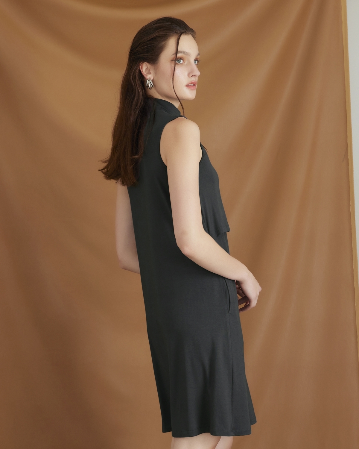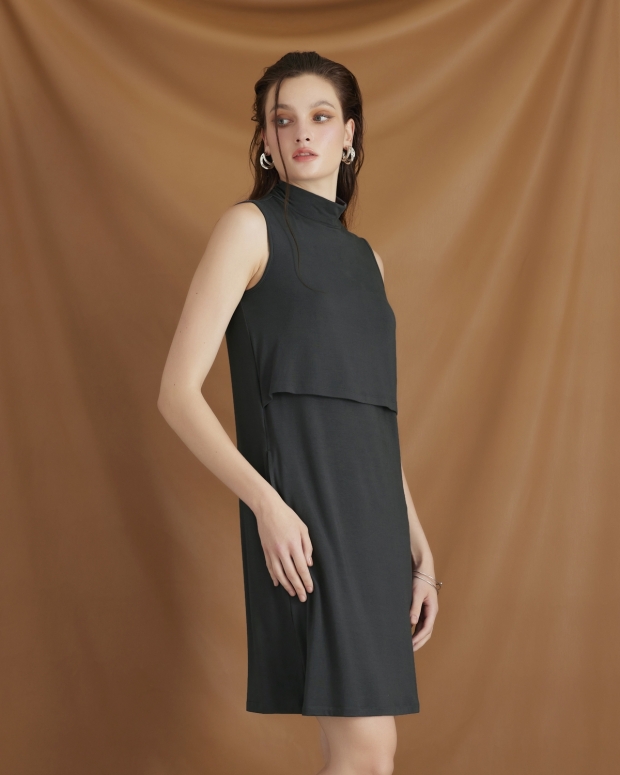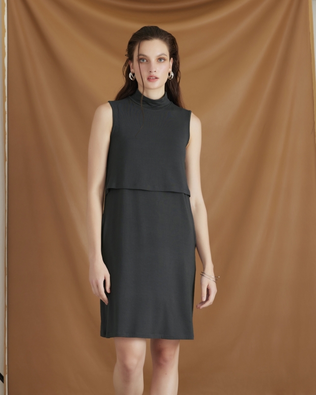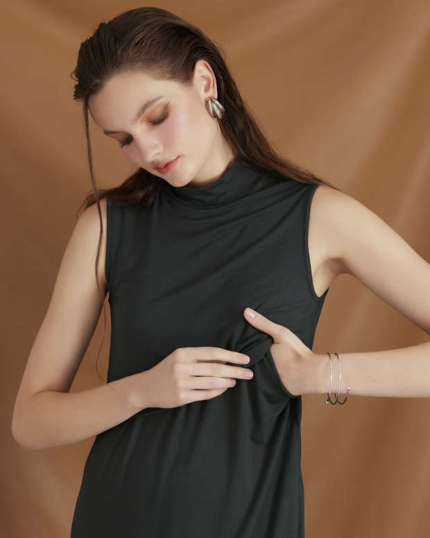 A sleeveless maternity and nursing dress with a turtleneck design to enhance the mother’s chicness. The fabric is soft, ensuring comfortable wear. It has a crop front detail that allows for convenient nursing and ensures readiness anytime, both indoors and outdoors.