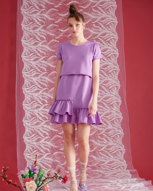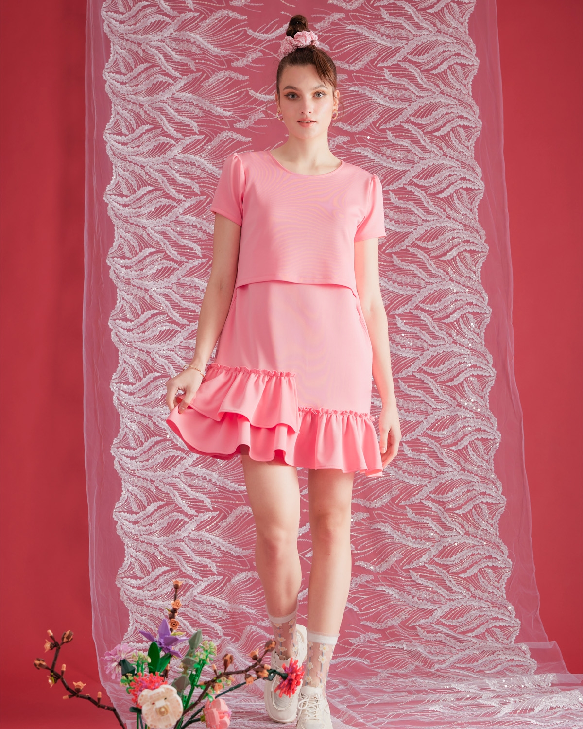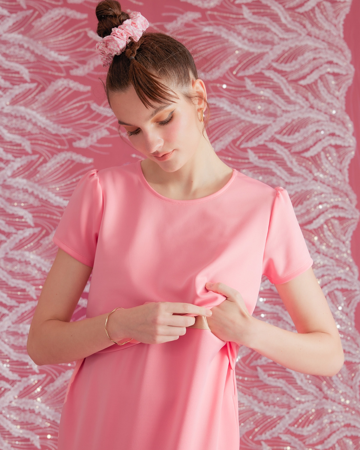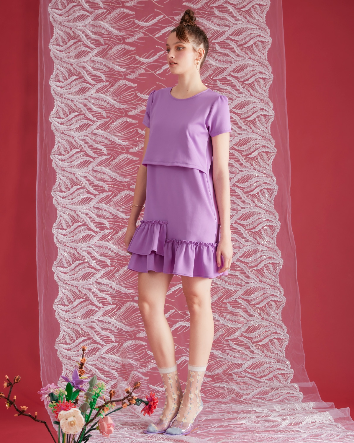 Short-sleeved maternity and nursing dress adorned with ruffle details at the hem of the skirt. The fabric is soft, ensuring comfortable wear. The dress allows for convenient nursing or pumping so that mothers feel ready to nurse in any situation.
