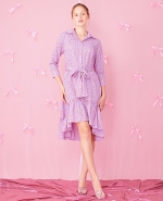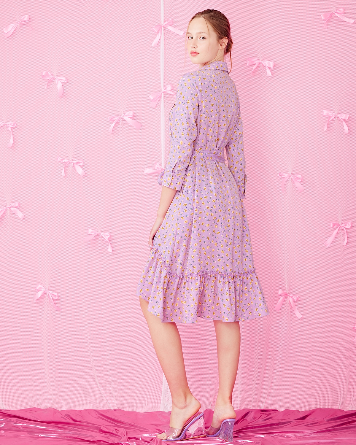 Maternity and nursing dress with elbow sleeves, shirt collar, and front buttons. It features a fluttering skirt and an asymmetrical hem to add a playful touch. The dress comes with a waist tie to create a defined shape, perfect for pregnant and postpartum mothers. Versatile for work or outdoor activities, it offers convenient nursing and eliminates any concerns about pumping and nursing.