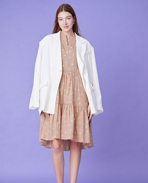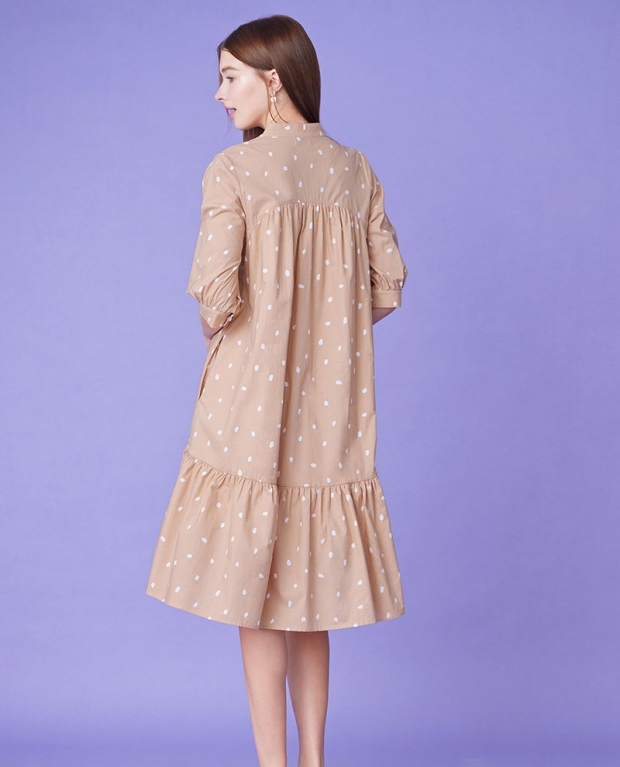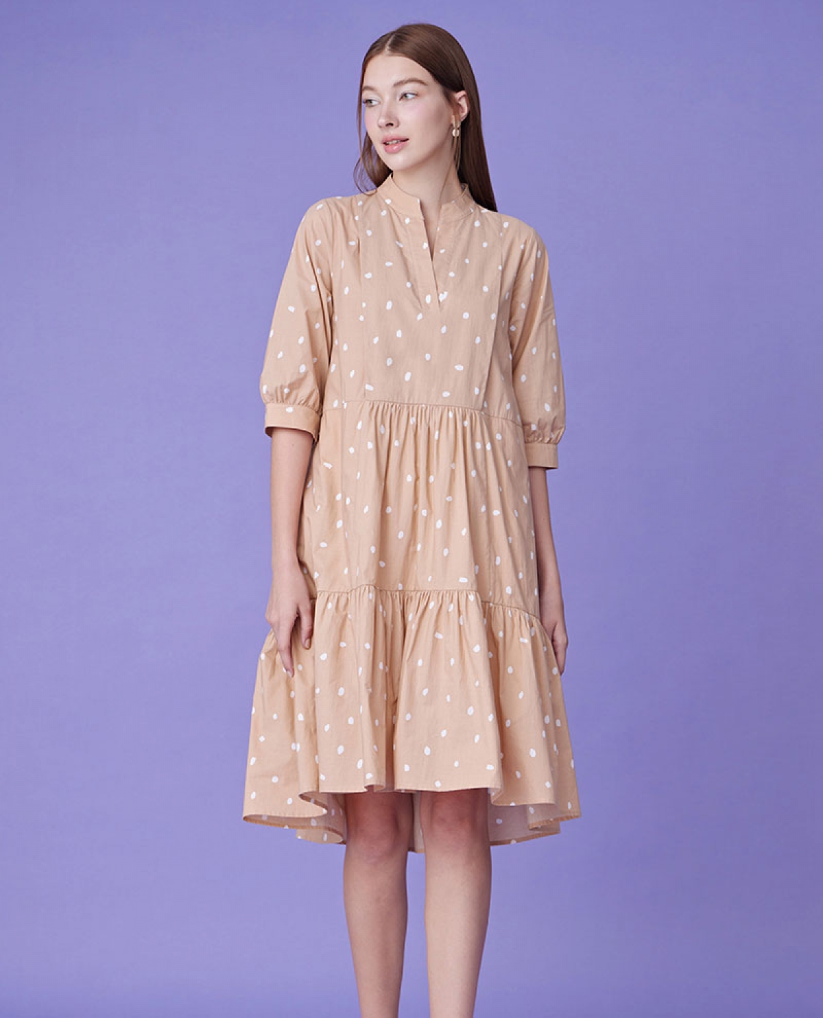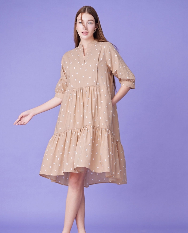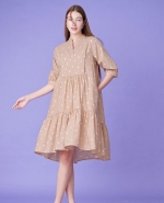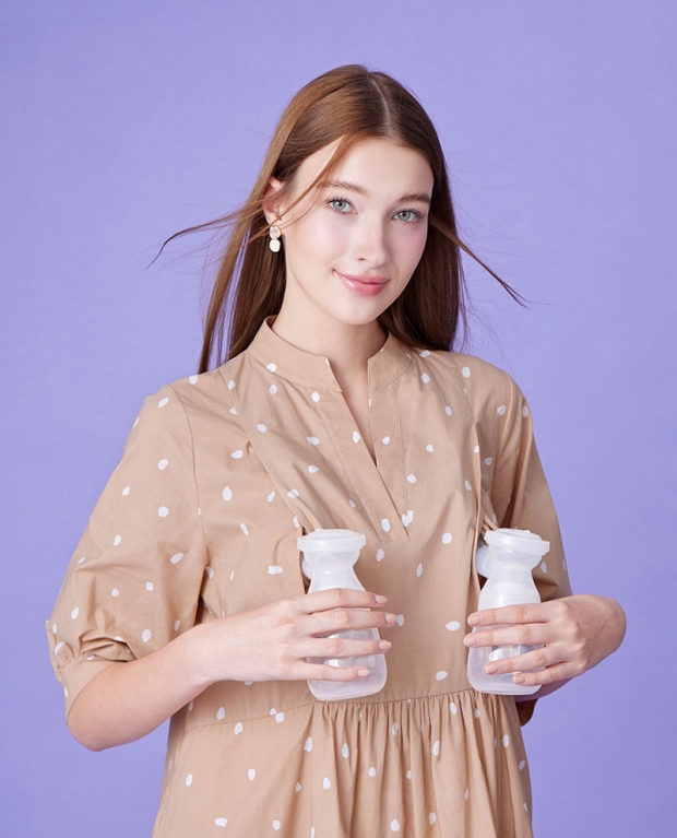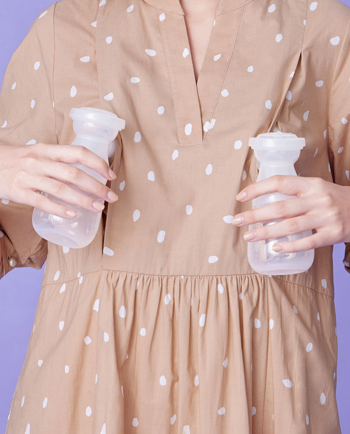 Maternity and nursing dress with a V-neckline and elbow sleeves. The dress features a double-layer fluttering skirt for added elegance. It is designed with a front milk channel to cater to the needs of mothers. Made from premium cotton and lined with Japanese cotton, the dress ensures comfortable wear and provides a soft touch for both mother and baby.