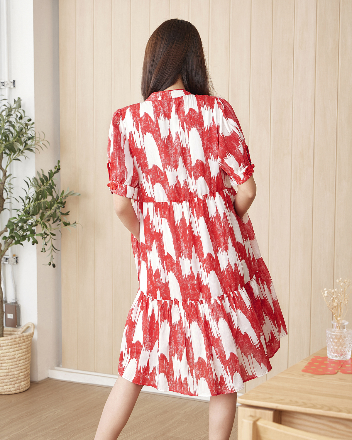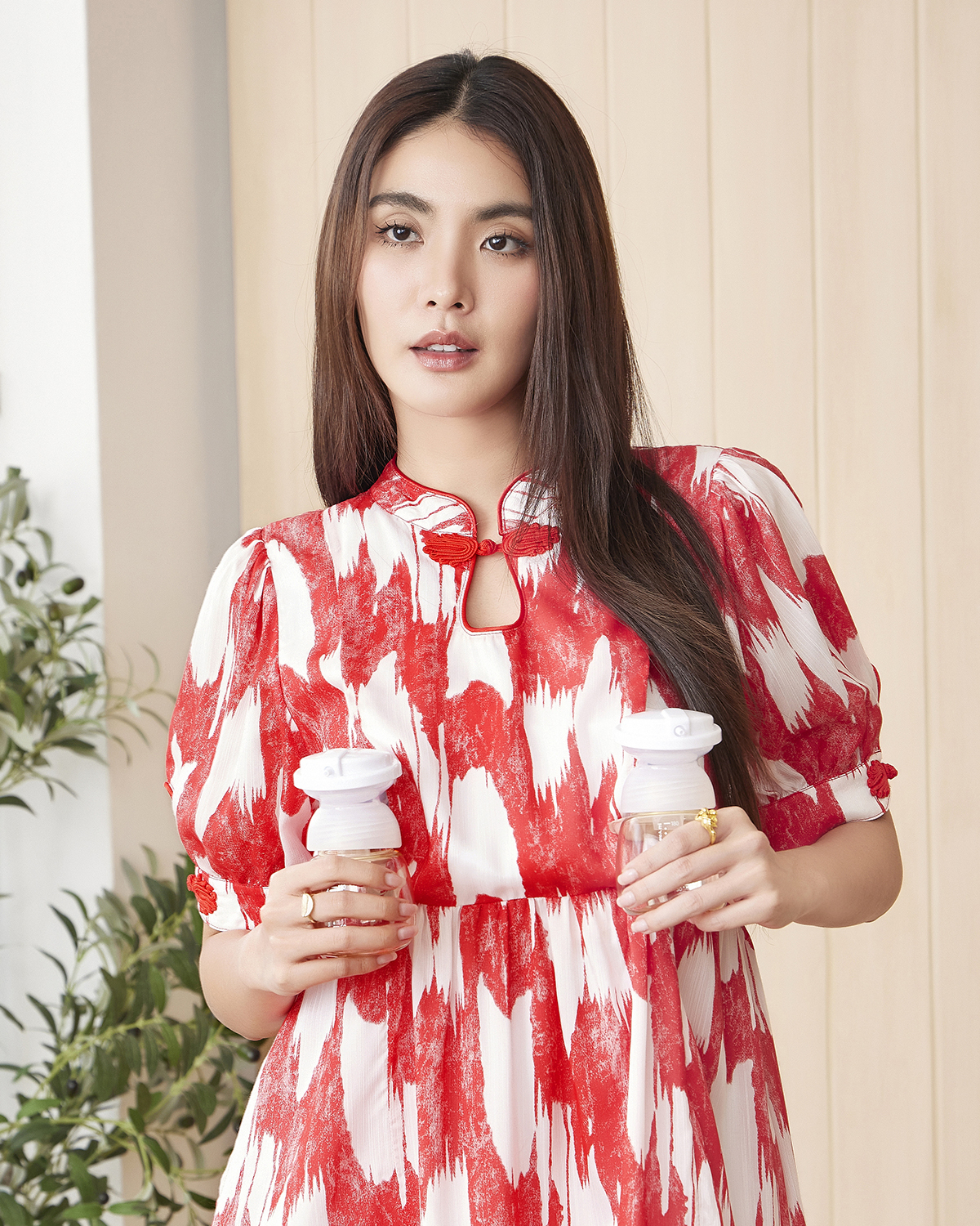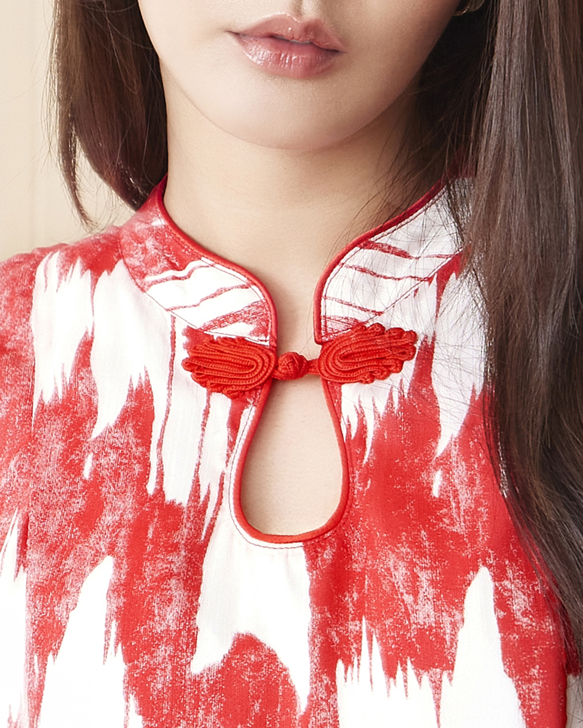 Qipao maternity and nursing dress with mandarin collar. Decorated with Chinese-style buttons on the front and wrist areas. Made with breezy material, swaying gently as you move. Clever front panel enables you to discreetly nurse your baby anywhere anytime.