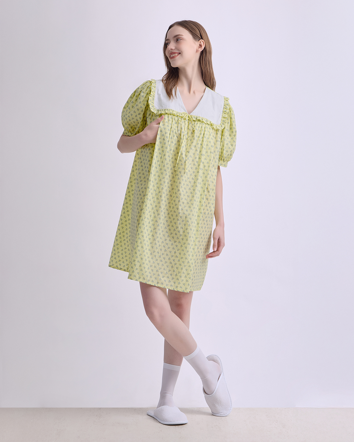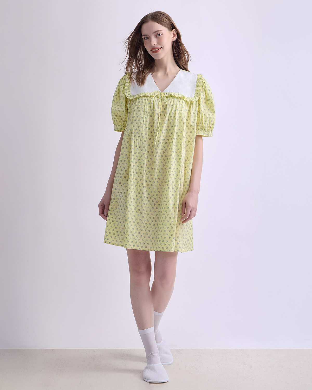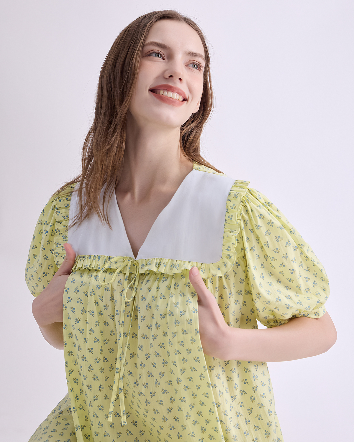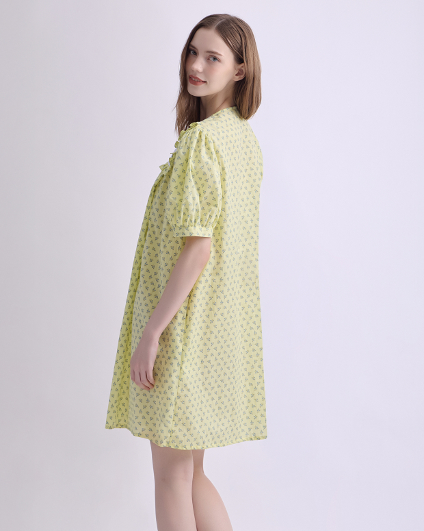 A cozy nursing pajamas crafted from soft cotton with a charming printed pattern. Designed with a wide collar and delicate bow tie, it features hidden nursing access for easy nighttime feeding. Light, airy, and gentle on the skin — perfect for rest, comfort, and motherhood.