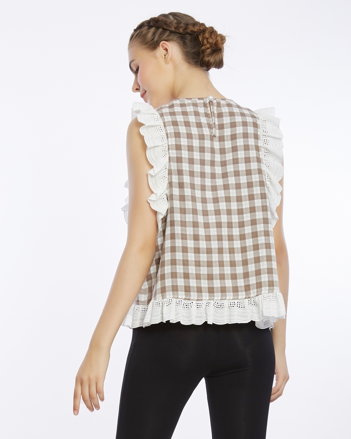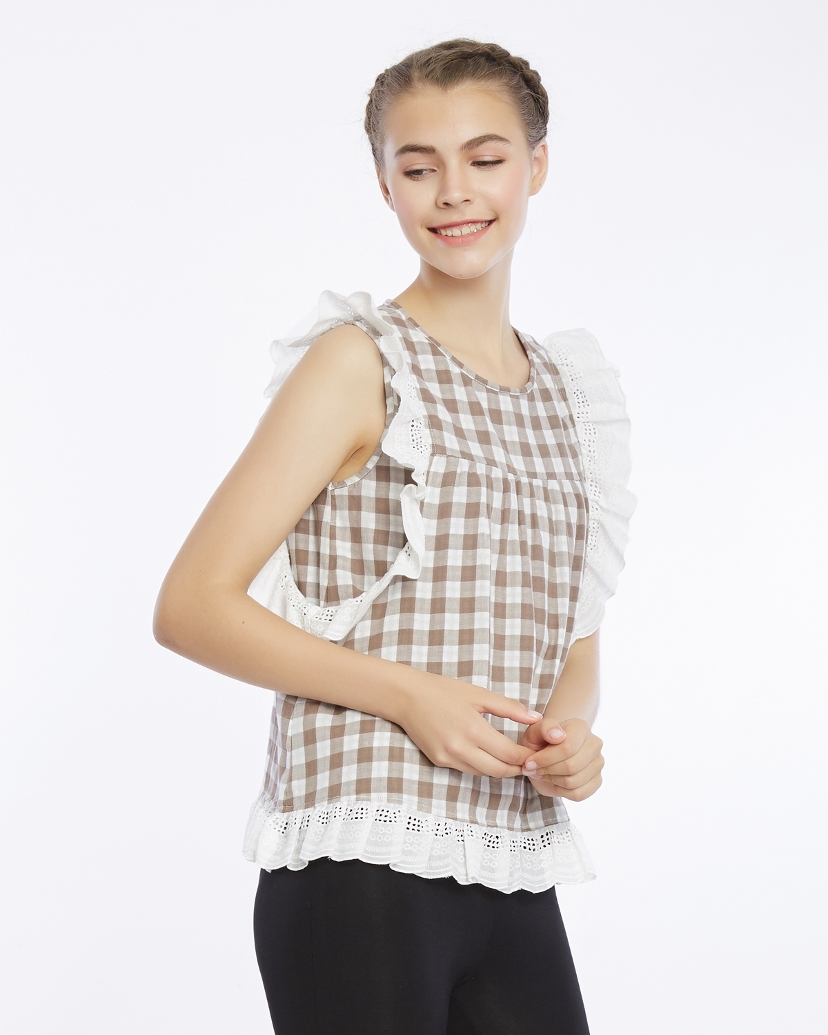 Become cute and chic in Nolana, cute nursing blouse with flounced lace around the armholes and hem. Made from 100% cotton in soft brown flannel and tie at the waist helps to flatter your body shape. Nursing feature at the armholes allows you to access easier breastfeeding and pumping whenever you need.