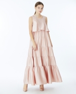 ชุดเดรสให้นมบุตรแขนกุด สไตล์แมกซี่เดรส สุดExclusive เนื้อผ้าซิลค์ซาตินสีโรสโกลด์ สัมผัสลื่น ให้ความเงา ดูหรูหรา ดีเทลตัดต่อกระโปรงระบายชั้น ดูโปร่ง ให้ความสบาย สวมใส่ไปงานเลี้ยง ออกงานสังสรรค์ ให้นมบุตรได้สะดวกสบาย