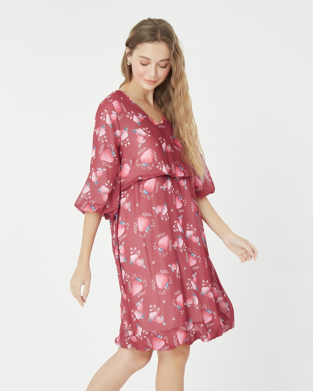 ชุดเดรสให้นมบุตรแขนสั้น ลายผ้าสุดพิเศษจาก Nitan ใน Collection "Sweet and sour Fragaria" ดีไซน์ชุด คอวี ทรงโอเวอร์ไซส์ กระโปรงทรงบอลลูน ชุดถูกออกแบบให้คุณแม่ปั๊มนมและให้นมลูกน้อยได้สะดวกสบาย สีสันสดใส ให้คุณแม่เคลื่อนไหวได้สะดวก พร้อมให้นมบุตรในที่สาธารณะได้ทุกสถานการณ์