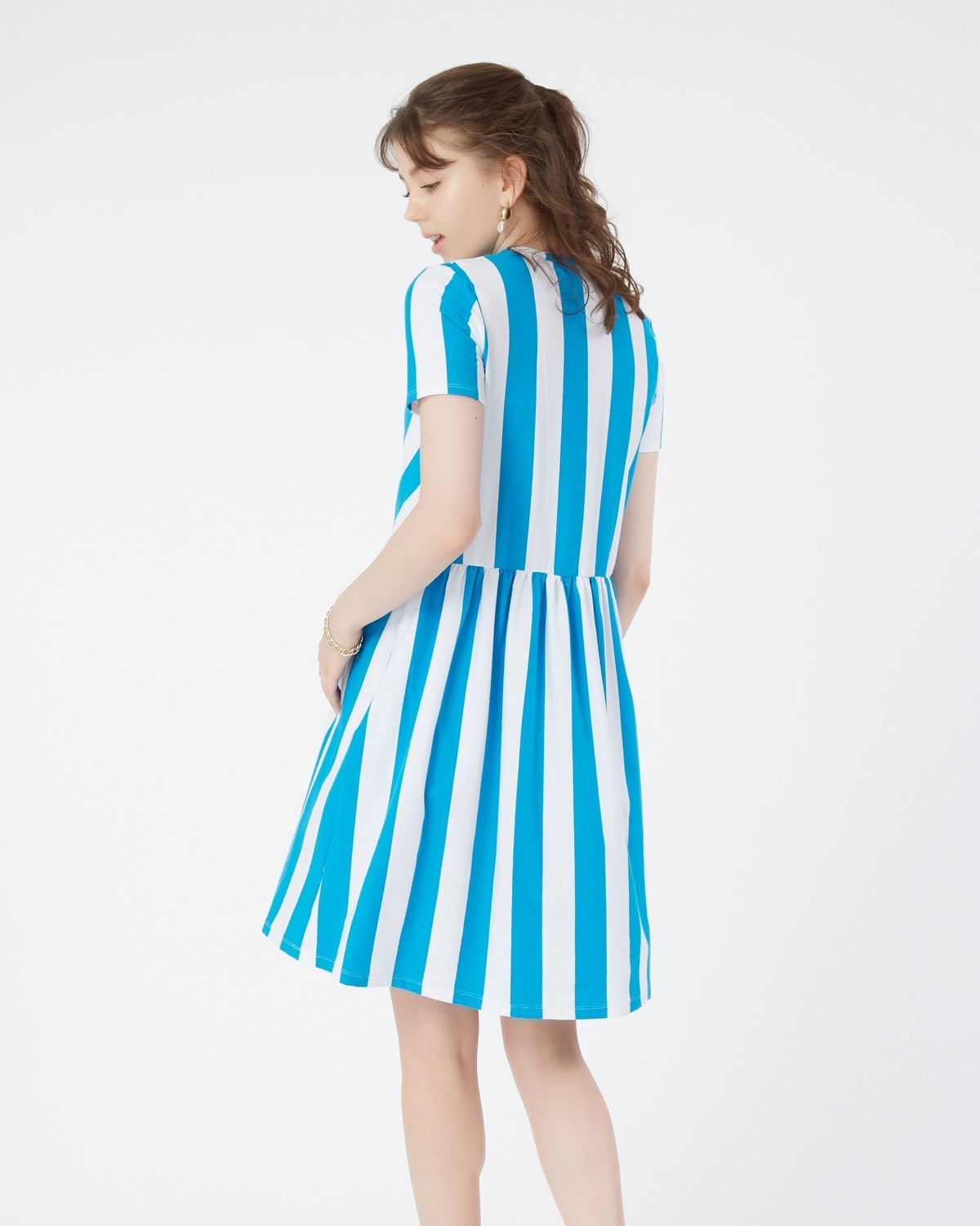 ชุดเดรสให้นมบุตรแขนสั้น ลายริ้ว อำพรางหุ่น ทำให้คุณแม่ดูเพรียวขึ้นทันตา เนื้อผ้ายืด+สแปนเดกซ์ ทำให้มีความยืดหยุดได้ดีมาก อีกทั้งยังสวมใส่สบาย ไม่ร้อน ผ้าไม่หนาเกินไป ช่องให้นมบุตรเปิดได้กว้างพอดิบพอดี ไม่โป๊ และยังเข้าเต้าลูกแฝดหรือปั๊มนมทั้ง 2 ข้างได้พร้อมกันอย่างสะดวกสบาย