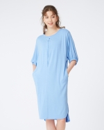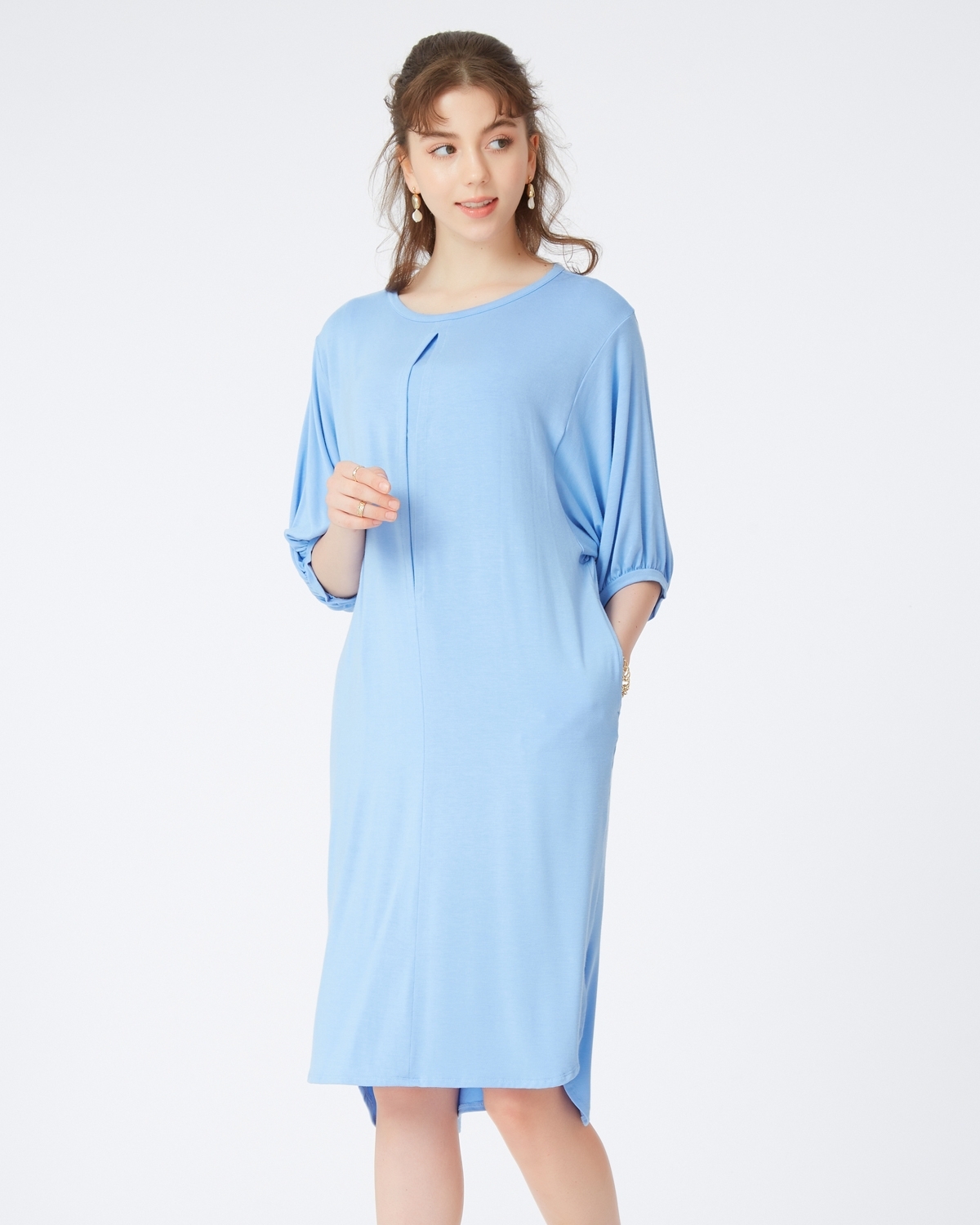 ชุดเดรสให้นมบุตรแขนสามส่วน ผลิตจากผ้ายืด + Spandex เนื้อผ้านุ่มสวมใส่สบาย ผ้ามีความยืดหยุ่นได้ดีมาก ชุดเป็นทรง Oversize ใส่หลวมๆ ทำให้คุณแม่คล่องตัวเวลาสวมใส่ สามารถทำกิจกรรมกับลูกน้อยได้หลากหลาย และชุดยังช่วยช่วยพรางหน้าท้องและสะโพกให้คุณแม่มั่นใจในการสวมใส่เสื้อผ้ามากขึ้น ชุดออกแบบมาให้สามารถให้นมได้สะดวกสบาย ทั้งยังสามารถให้นมบุตรหรือปั้มนมได้ในสถานที่สาธารณะอย่างหมดกังวล