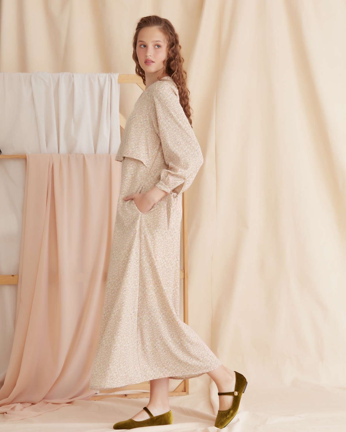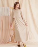 ชุดคลุมท้องและเดรสให้นมบุตร เป็นแม็กซี่เดรสแขนยาว ทรงเอ ชายกระโปรงมีความพลิ้วไหว ทำให้คุณแม่ดูสวยเรียบหรู เพิ่มดีเทลความอ่อนหวานด้วยโบว์ที่ปลายแขน ให้นมหรือปั๊มนมสะดวกสบาย เพื่อให้คุณแม่พร้อมเสมอสำหรับการให้นมบุตรในทุกสถานที่