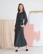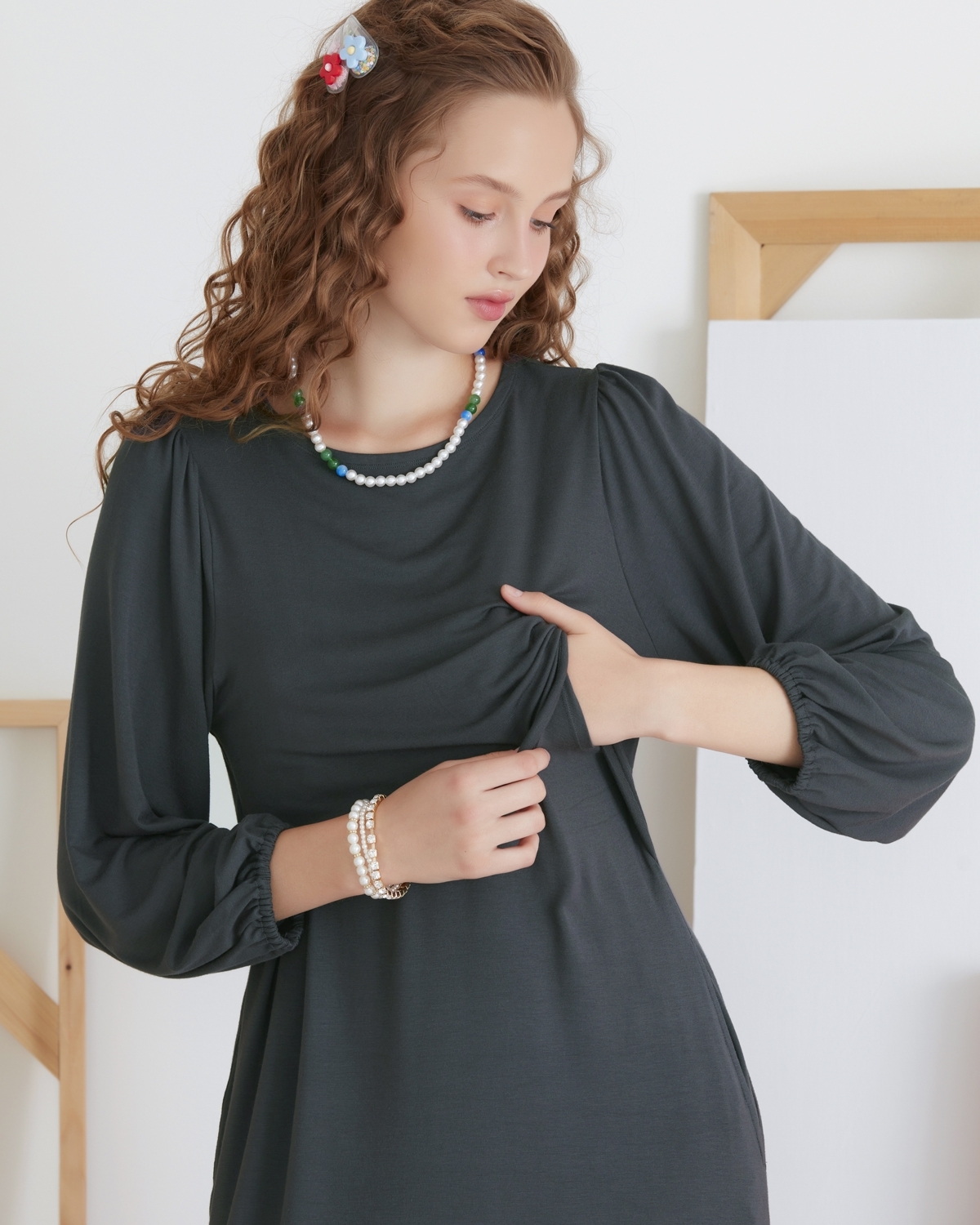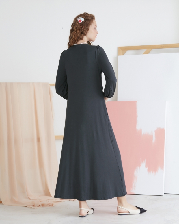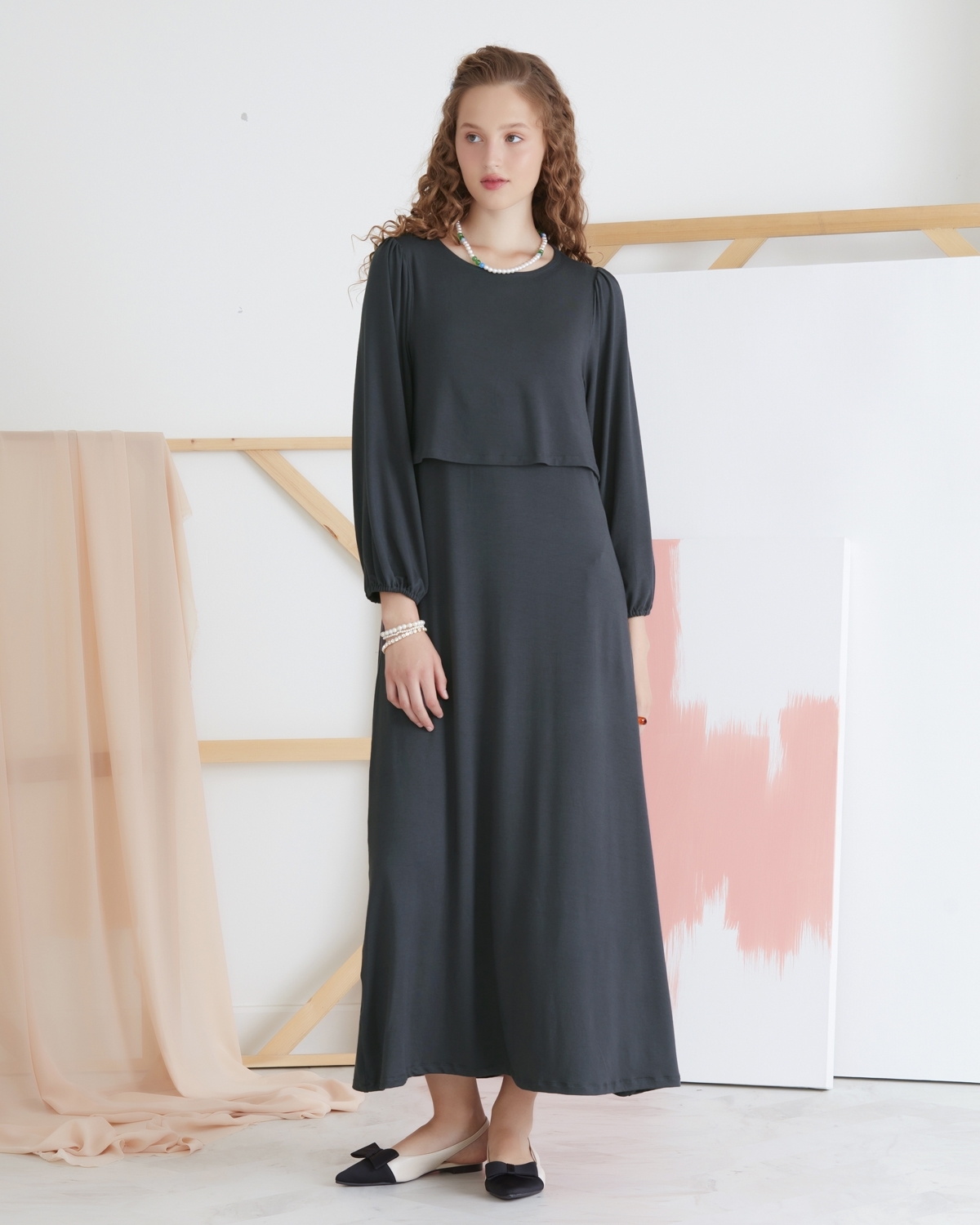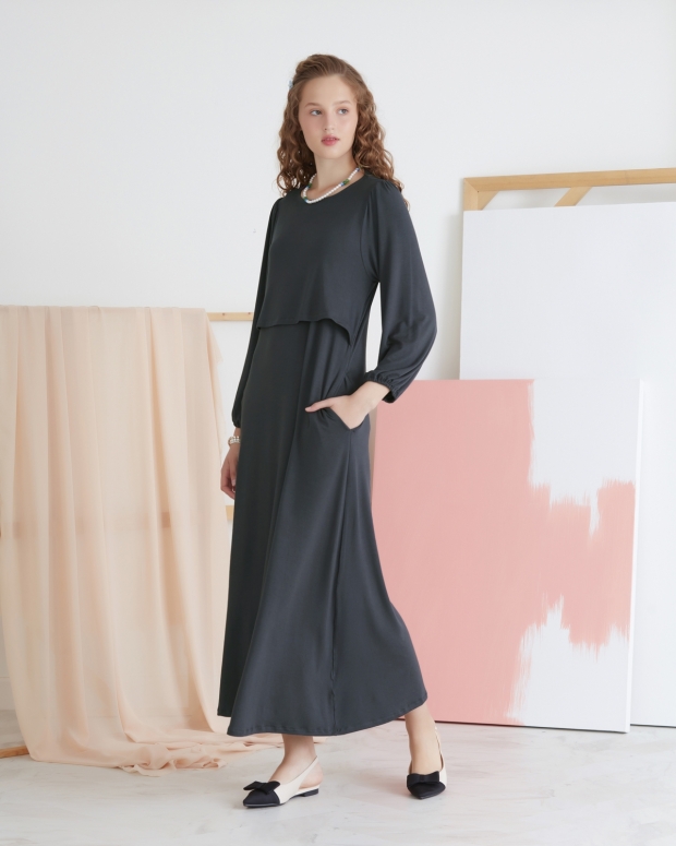ชุดคลุมท้องและเดรสให้นมบุตร เป็นแม็กซี่เดรสแขนยาว ทรงเอ ชายกระโปรงมีความพลิ้วไหว ทำให้คุณแม่ดูสวยเรียบหรู ผ้ายืด สวมใส่สบาย ให้นมหรือปั๊มนมสะดวก เพื่อให้คุณแม่พร้อมเสมอสำหรับการให้นมบุตรในทุกสถานที่