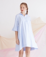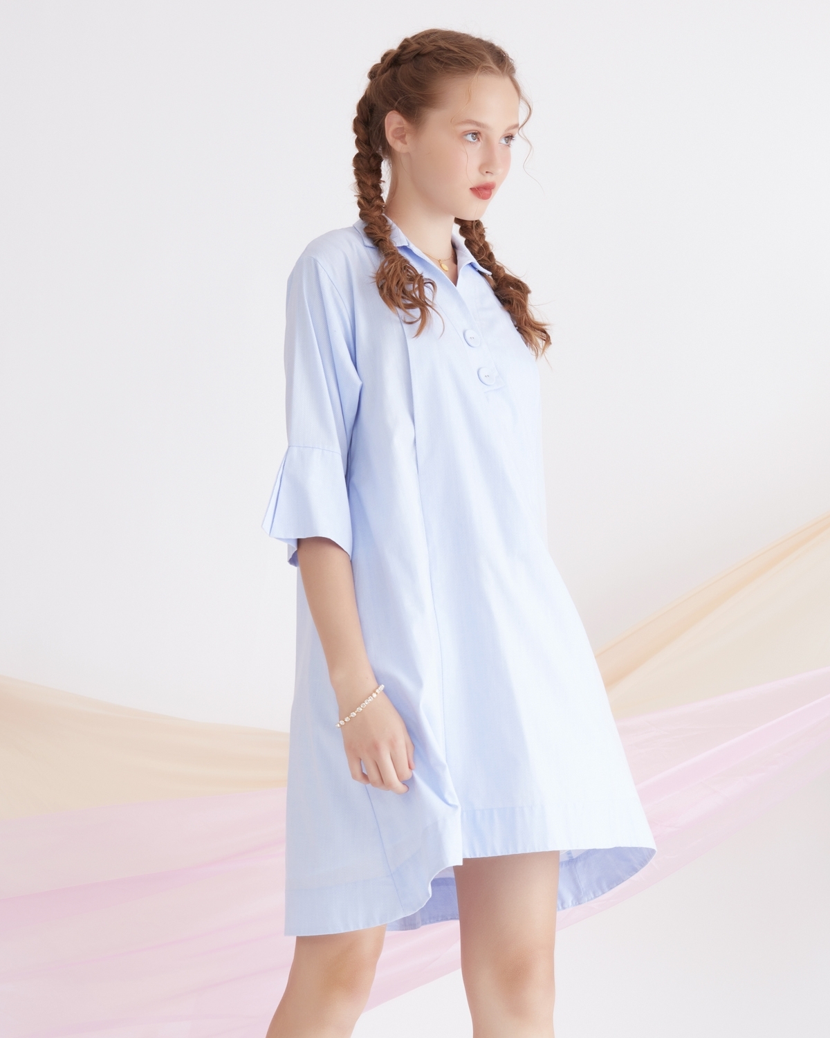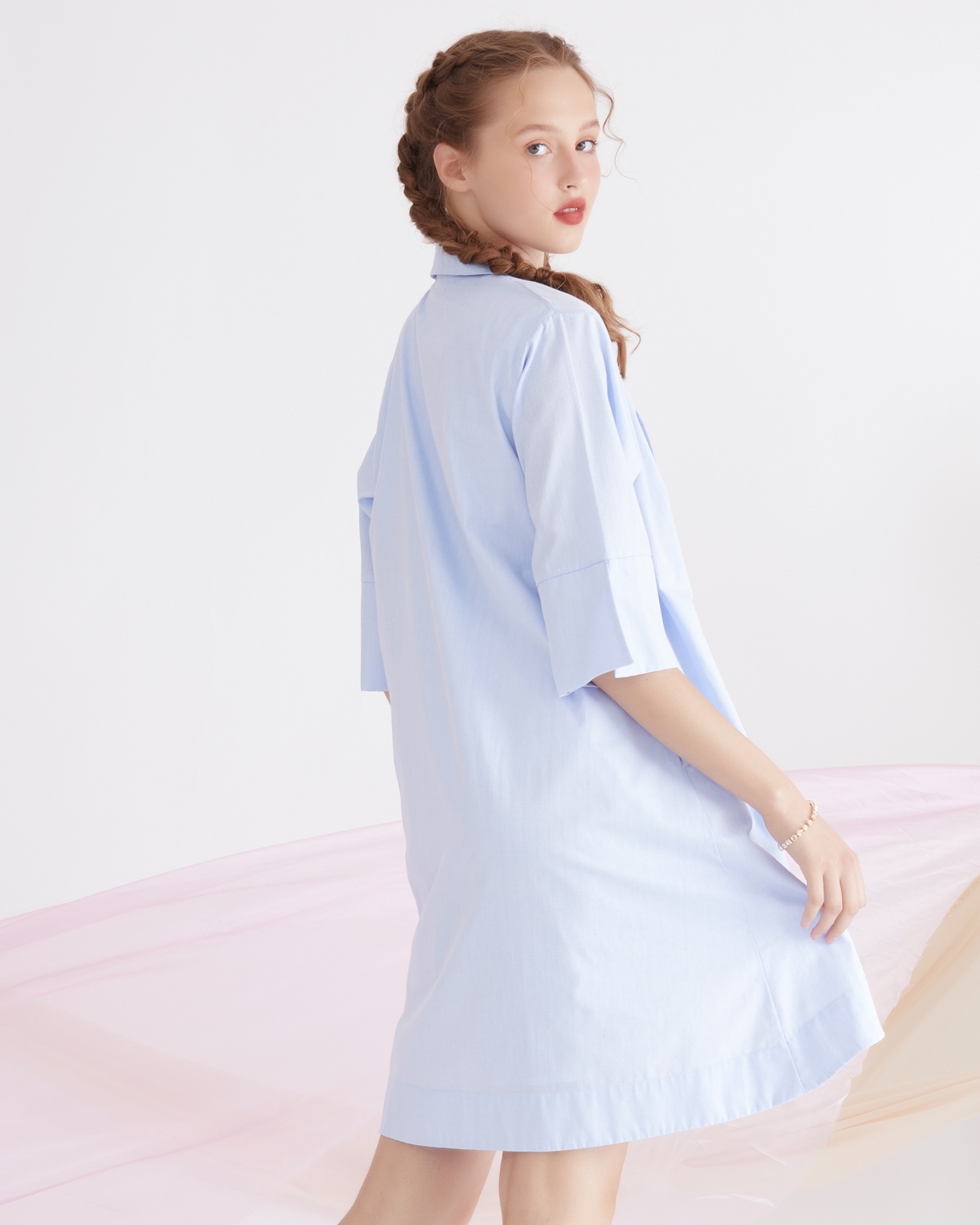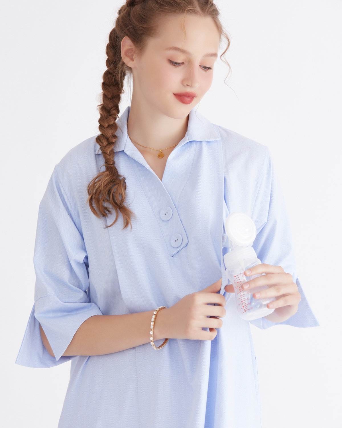 ชุดคลุมท้อง เดรสให้นมบุตร ปกเชิ๊ต แขนห้าส่วน ปลายแขนระบายเล็กน้อยเพิ่มความคล่องตัวให้คุณแม่ ช่องให้นมเรียบเนียนไปกับชุด ปั๊มนมหรือให้นมบุตรทั้งสองข้างพร้อมกันได้สะดวกสบาย