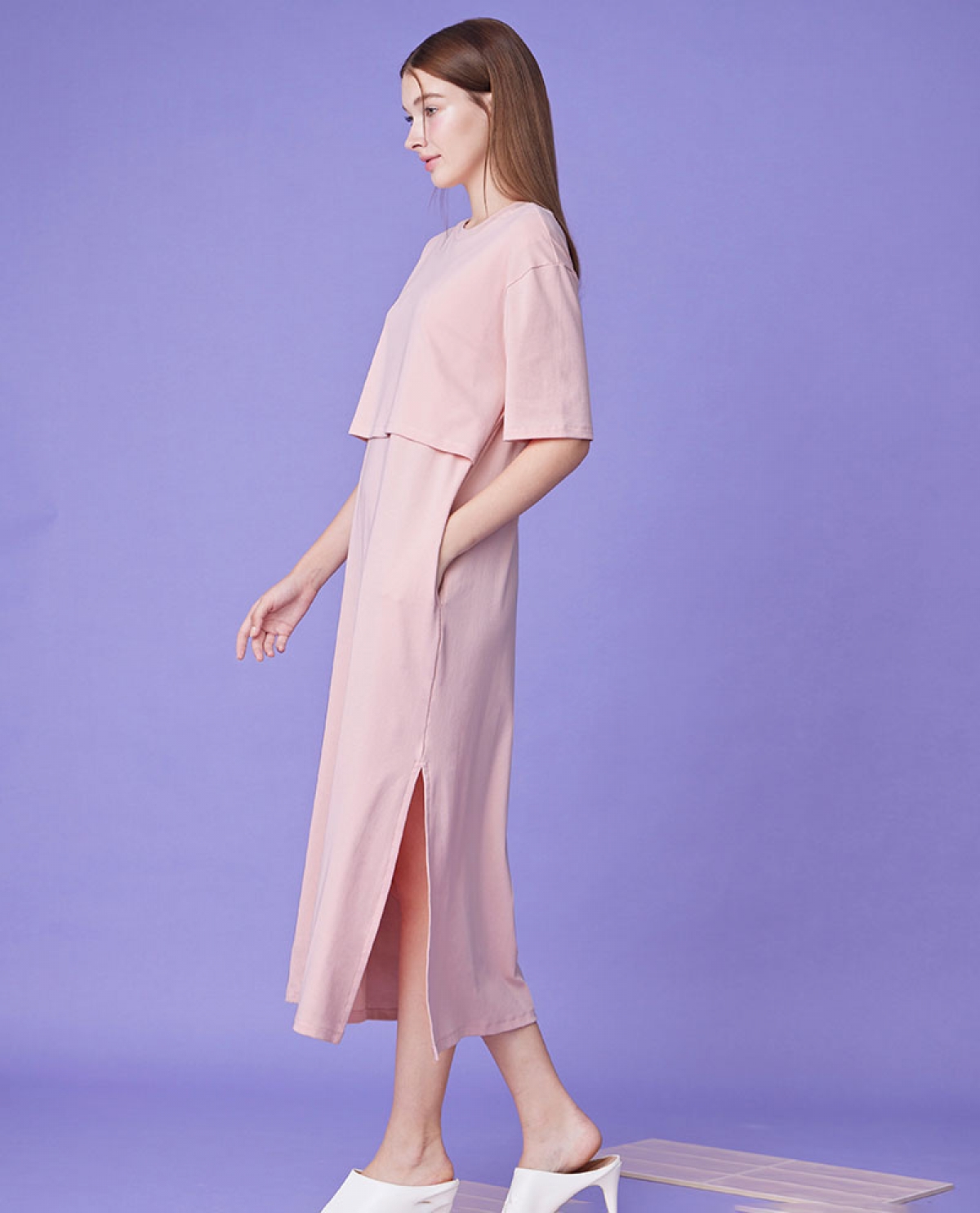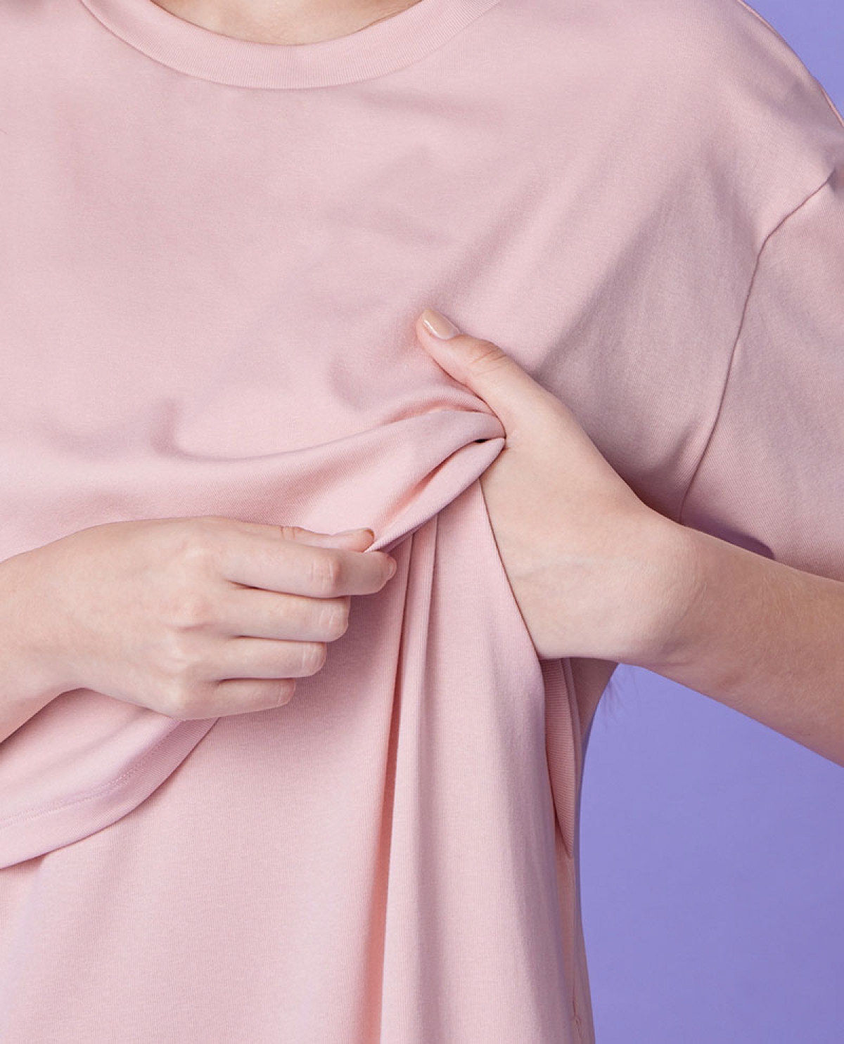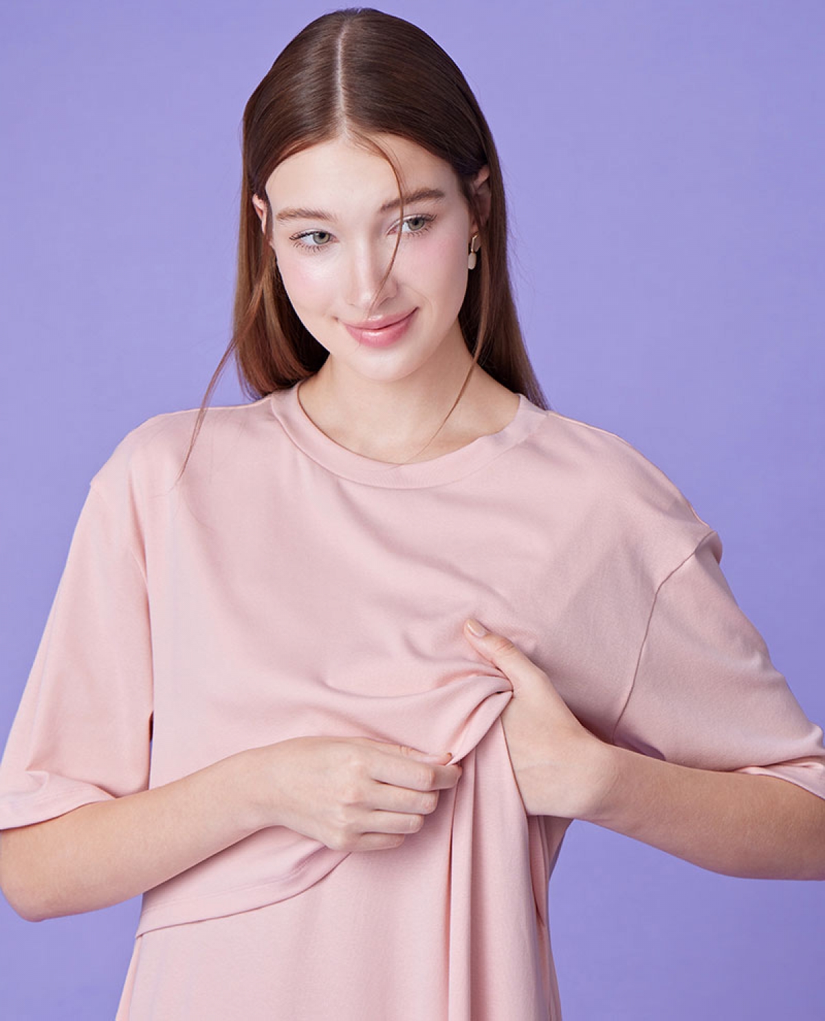 ชุดเดรสยาวให้นมบุตรแขนสั้น ทรง Oversize ใส่หลวมๆ เนื้อผ้านุ่มสวมใส่สบาย ไม่ร้อน ให้นมบุตรสะดวกสบาย เพื่อให้คุณแม่พร้อมเสมอสำหรับการให้นมบุตรทั้งในบ้านและนอกบ้าน