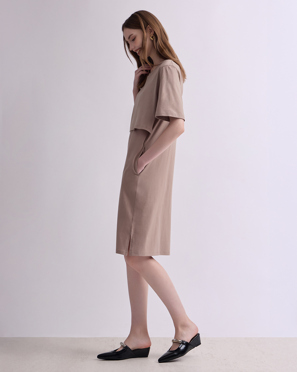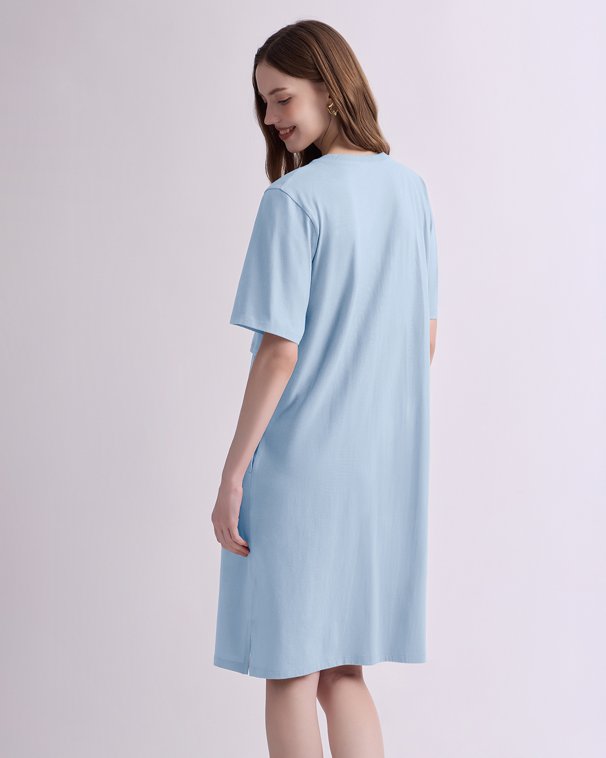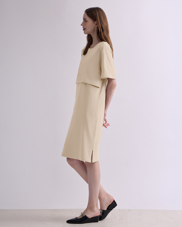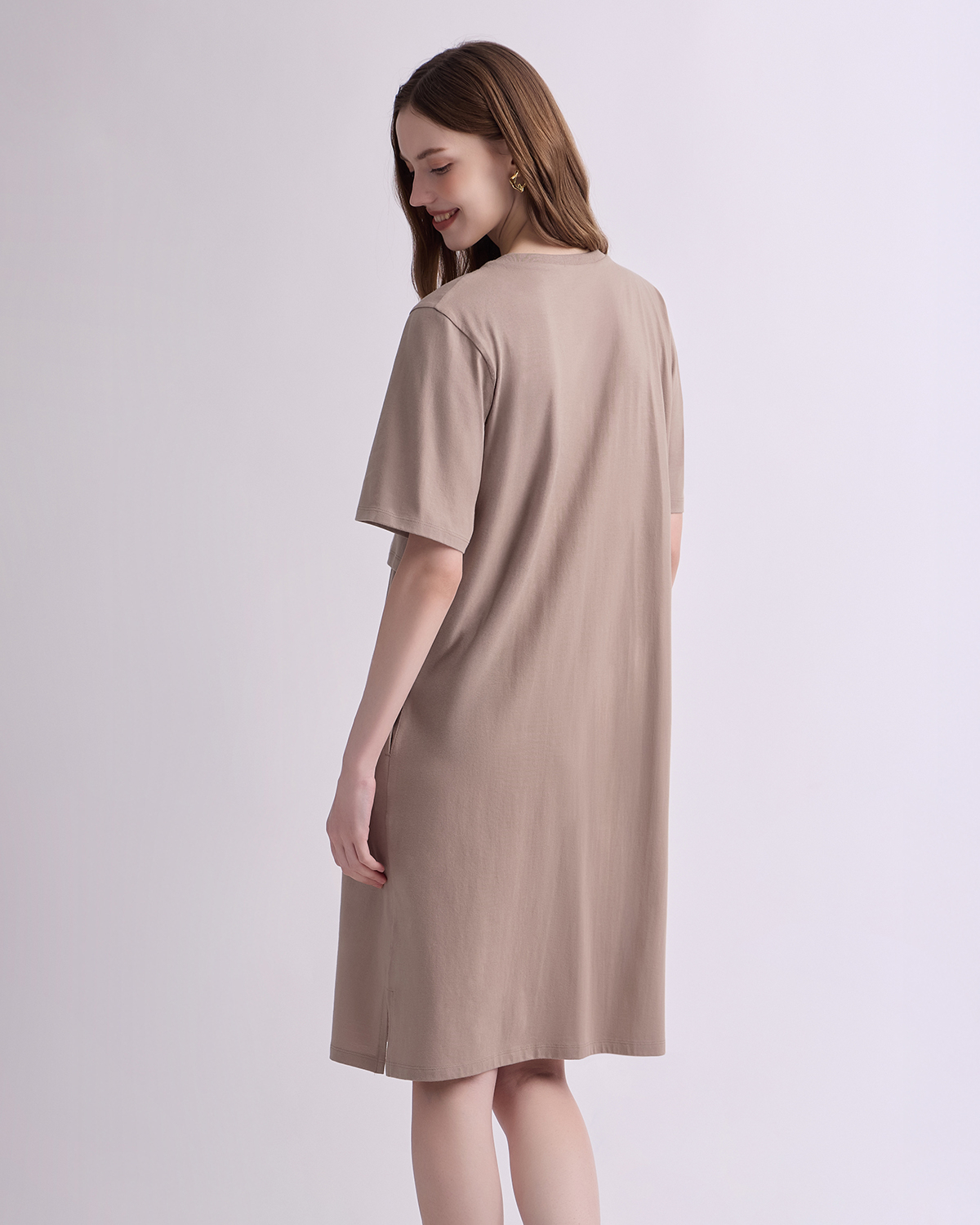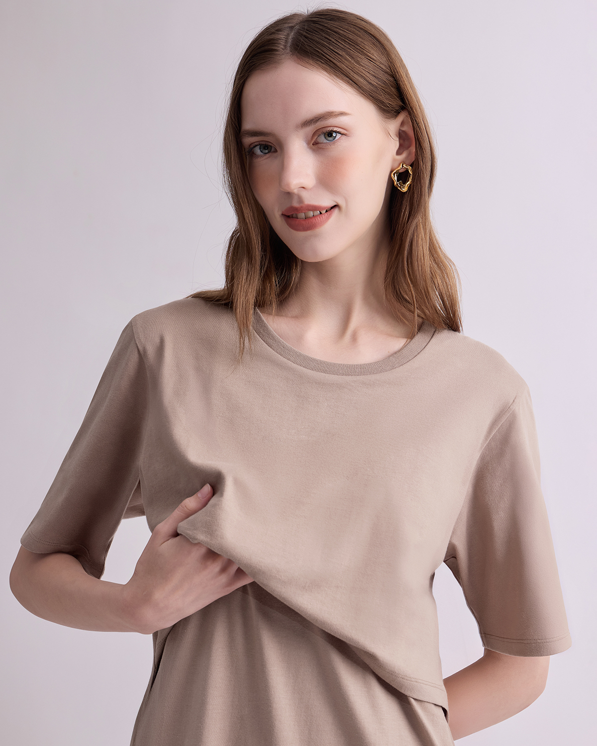 เดรสคลุมท้องและให้นมบุตรแขนสั้น เบสิกที่คุณแม่ทุกคนควรมี ทรงตรง ใช้งานง่าย ใส่ได้ในทุกวัน เนื้อผ้านุ่มสวมใส่สบาย ไม่ร้อน ด้วยผ้ายืดคอตตอน 100% ให้นมบุตรสะดวก ให้คุณแม่พร้อมเสมอสำหรับการให้นมบุตรทั้งในบ้านและนอกบ้าน
