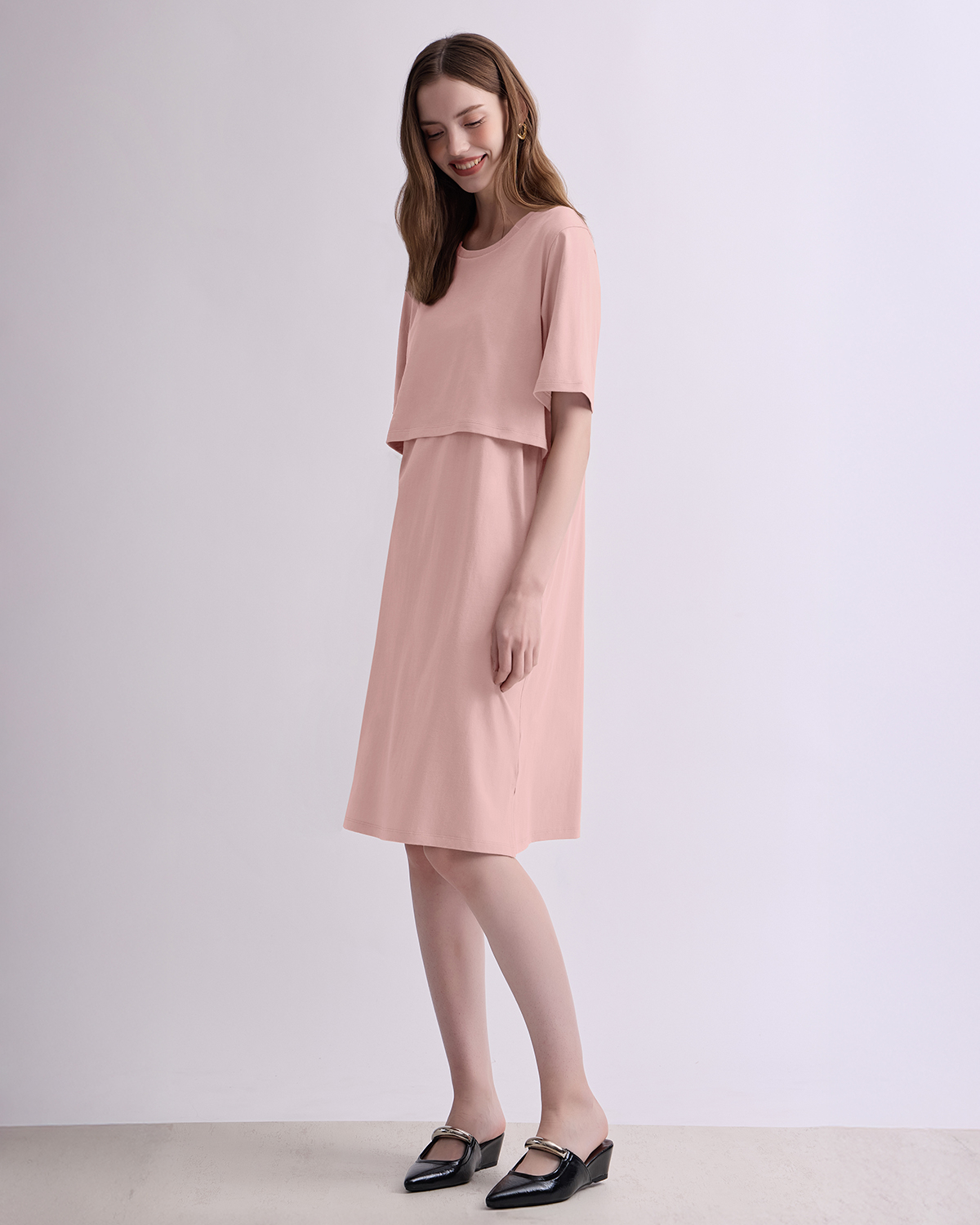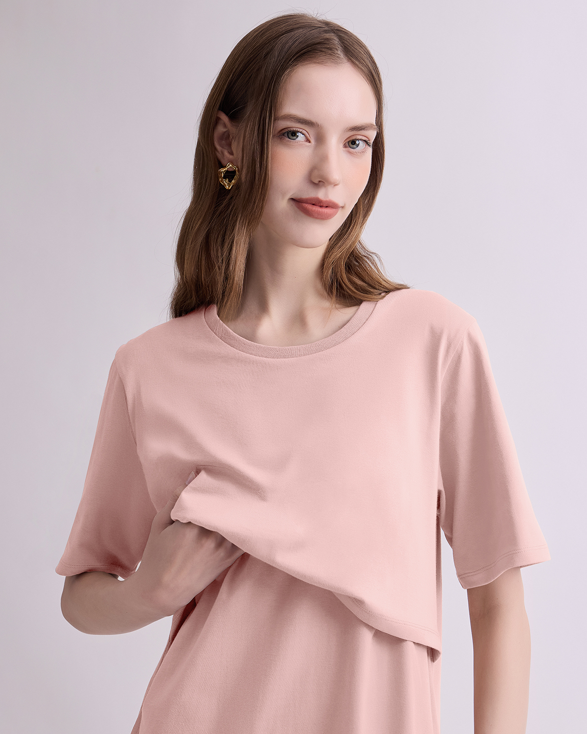 เดรสคลุมท้องและให้นมบุตรแขนสั้น เบสิกที่คุณแม่ทุกคนควรมี ทรงตรง ใช้งานง่าย ใส่ได้ในทุกวัน เนื้อผ้านุ่มสวมใส่สบาย ไม่ร้อน ด้วยผ้ายืดคอตตอน 100% ให้นมบุตรสะดวก ให้คุณแม่พร้อมเสมอสำหรับการให้นมบุตรทั้งในบ้านและนอกบ้าน