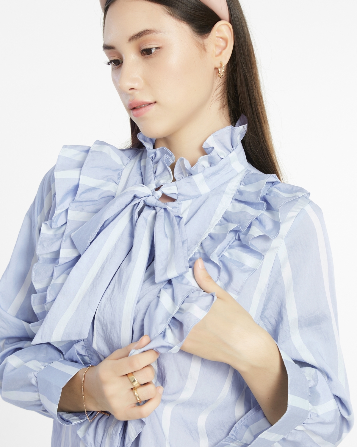 เชิ๊ตตัวยาวให้นมบุตรแขนยาว ผ้าคอตตอน + โพลีเอสเตอร์ ลายริ้วตามแนวยาวช่วยพรางรูปร่างให้ดูผอมเพรียว มีดีเทลระบายตรงช่องให้นมและโบว์ที่ช่วงคอ เนื้อผ้าบางเบาสวมใส่สบายไม่ร้อน สามารถแมทซ์กับกางเกงหลังคลอด หรือสวมใส่กับกางเกงพยุงครรภ์ได้