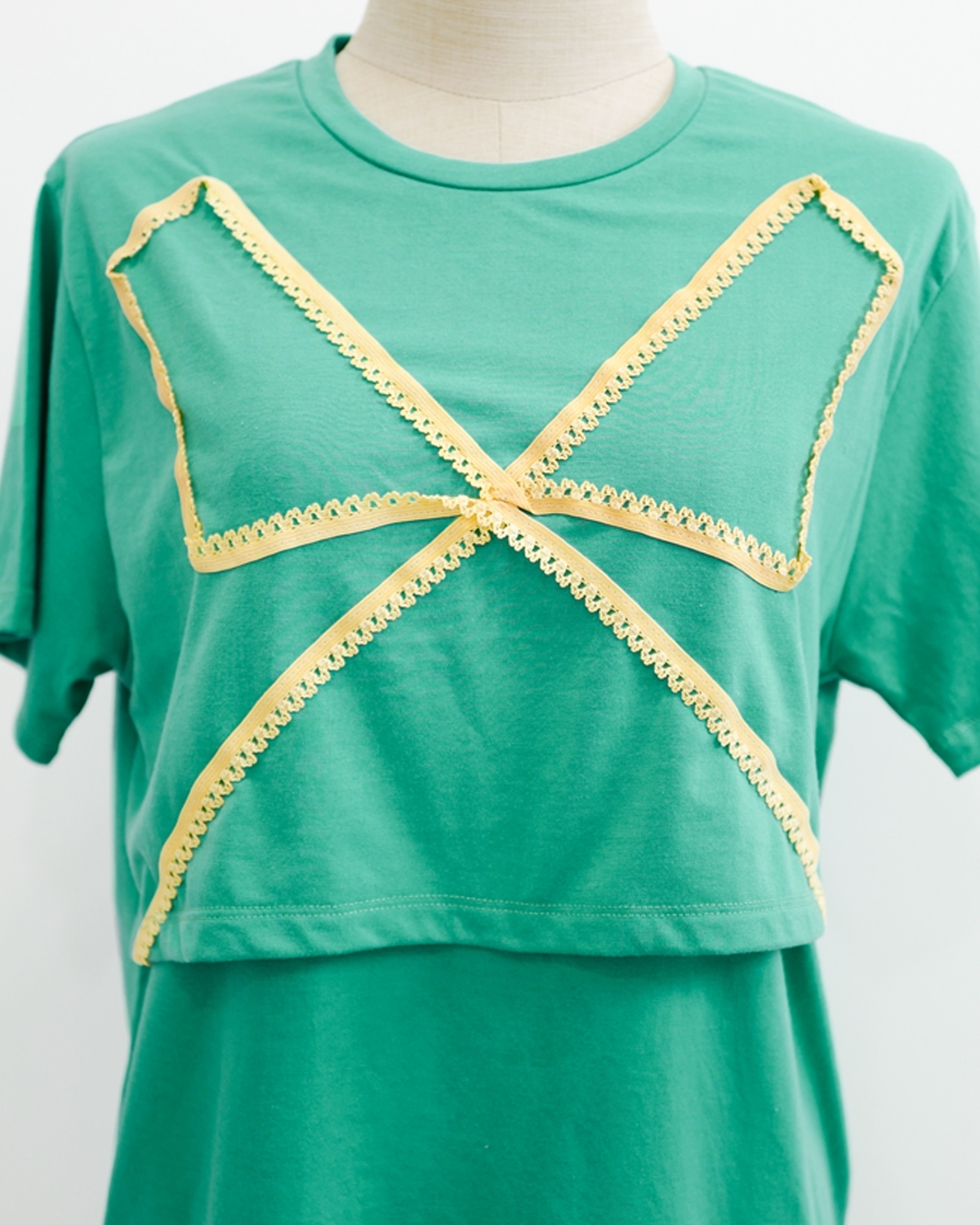 เสื้อให้นมบุตรแขนสั้น หลากหลายสีสันให้คุณแม่เลือกสวมใส่ เพิ่มดีเทลสุดหน้ารักด้วยระบายลูกไม่รูปโบว์ด้านหน้าเนื้อผ้านุ่ม สวมใส่สบาย ไม่ร้อน ให้คุณแม่พร้อมเสมอสำหรับการให้นมบุตรทั้งในบ้านและนอกบ้านอย่างไม่มีสะดุด